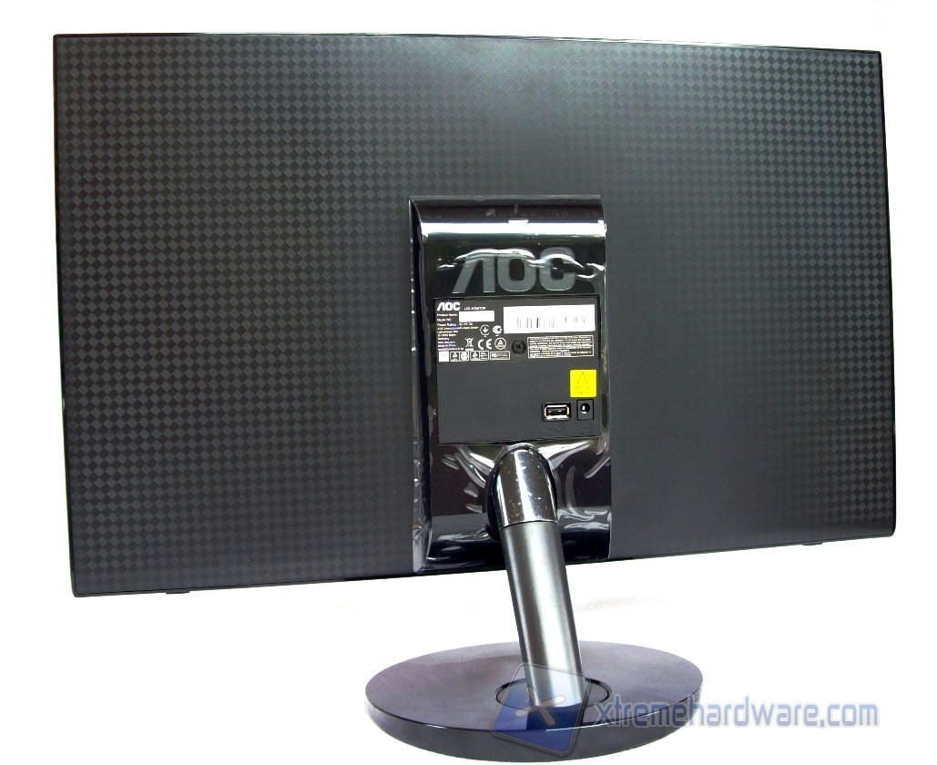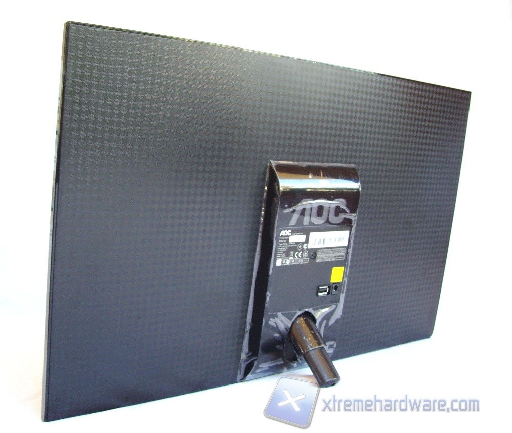 Posteriormente troviamo invece una trama in risalto che dimostra l’attenzione che AOC ha verso i propri prodotti. Oltre alle consuete informazioni riportate nel pannello posteriore, come il numero seriale, spicca la mancanza di una qualsiasi porta video, lasciando spazio alla sola presenza della connessione USB 2.0 e un connettore DC. Quest’ultimo è stato aggiunto qualora il PC in uso non sia in grado di fornire sufficiente corrente dalla presa USB. Sarà quindi necessario alimentare il monitor con un adattatore esterno, opzionale, con uscita DC 5V 3A.