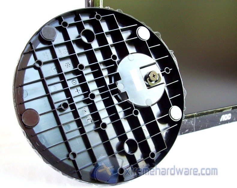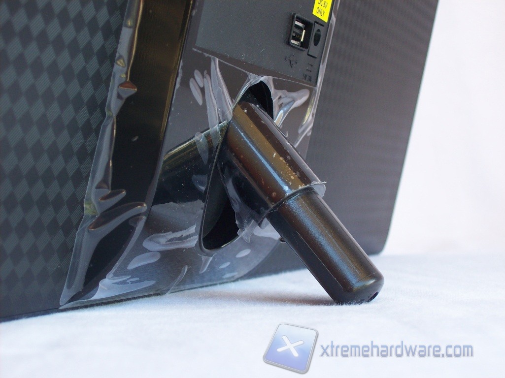 Sono inoltre presenti altri due gommini nella zona inferiore della cornice del display, utili per aumentare la stabilità in caso di rimozione del sostegno. Anche in questo caso è possibile regolare l’inclinazione dello schermo, ma è consigliabile non tenere il monitor perfettamente perpendicolare al tavolo, data l’esigua stabilità, e scegliere un’opportuna posizione piana. Con la rimozione della base, il monitor riduce l’altezza di 7 cm (320 mm) e lo spessore di 9 cm (105 mm) con angolazione massima.